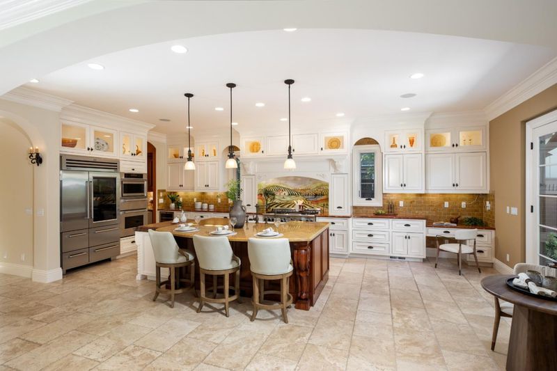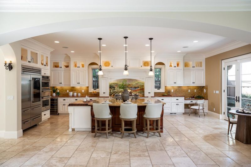 - Built-in BBQ Grill, Countertop - Marble, Dishwasher, Exhaust Fan, Garbage Disposal, Hood Over Range, Ice Maker, Island with Sink, Microwave, Oven - Built-In, Oven Range - Built-In, Gas, Pantry, Refrigerator, Warming Drawer, Wine Refrigerator