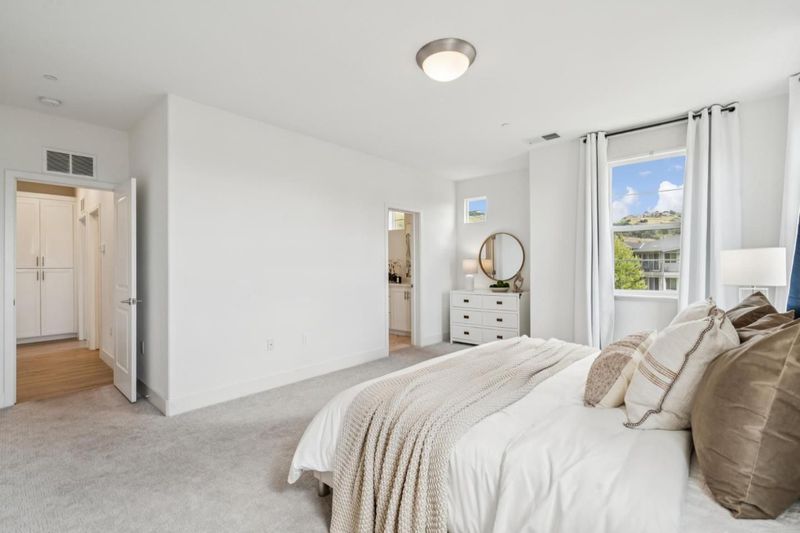 The best-situated & most-upgraded home in all of sold-out SoHay-the only residence with a truly unobstructed, spanning view across the hills of Garin Regional Park & the landscaped commons below-built to SoHay's top-tier finish package. A top-floor corner residence in like-new condition, with windows on 3 exposures that fill the home with exceptional natural light. 1,501 sq. ft., 2 bedrooms, 2 bathrooms, attached 1-car garage. The light-filled great room flows into a chef's kitchen with white shaker cabinetry, quartz waterfall island, herringbone backsplash, s/s appliances, & a walk-in pantry. The primary suite is oriented to the view, with corner windows framing the green hillside & a spa-style bath-dual vanities, marble-look tile, and a walk-in shower with built-in bench. Walk-in closets in both bedrooms. The covered private balcony takes in the hills, trees, & the open horizon. Energy-smart with rooftop solar & a tankless water heater meaningfully reduce monthly utility costs. Walk to South Hayward BART, with I-880, I-580, Hwy 238, & the San Mateo Bridge close bySF, Silicon Valley, the Peninsula, & Cal State East Bay all within reach, and 5,800+ acres of Garin trails next door. SoHay is sold out- this is the only way in, & the finest residence the community has to offer.