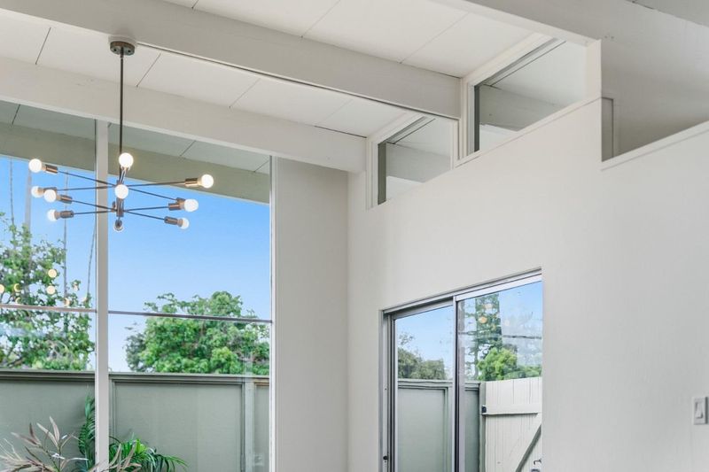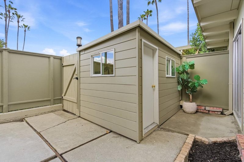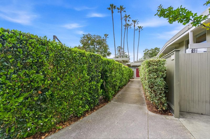 Lives like a single-family home, this bright mid-century modern residence offers high ceilings, single-level living, and a rare sense of space. Open-beam ceilings and expansive picture windows fill the home with natural light, creating an airy atmosphere throughout. The layout flows seamlessly between living, dining, and kitchen areas while maintaining comfortable separation. The living room with a classic brick fireplace opens to a private yard through sliding glass doors. A versatile bonus room in the yard is ideal for a home office, studio, or quiet retreat. All on one level, the home features generously sized bedrooms, including a spacious primary suite with an updated bath and walk-in shower. Additional highlights include hardwood floors, in-unit washer and dryer, a new water heater, and attached covered parking. Located in the gated Las Casitas community with pool and landscaped grounds. Directly across from Cubberley Community Center and moments to Piazzas Fine Foods, plus close to parks, dining, commute routes, and top-rated Palo Alto schools.